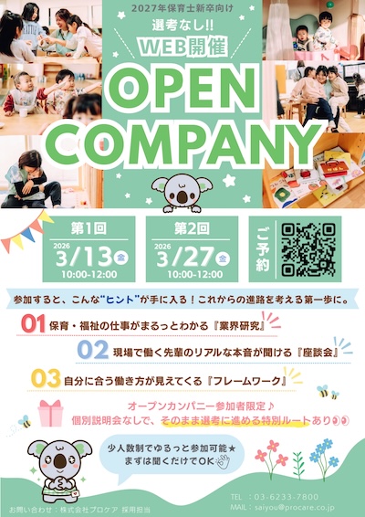 | 特記事項 | 【グループ会社】 センコーグループホールディングス株式会社 ▼公式ホームページはこちら ちゃいれっく保育園 | 株式会社プロケア | Procare ▼公式Instagramはこちら ちゃいれっく保育園 | 株式会社プロケア | Procare ▼公式LINEはこちら 株式会社プロケア | 採用窓口 ▼リズム遊びの様子はこちら ちゃいれっく保育園~リズム遊び~ ▼食育の様子はこちら ちゃいれっく保育園~食育~ ▼読み聞かせの様子はこちら ちゃいれっく保育園~読み聞かせ~ ▼ちゃいれっく保育園の1日はこちら ちゃいれっく保育園~1日~ |